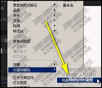 4、即時彈出一列菜單,從菜單中,鼠標(biāo)放在關(guān)鍵幀輔助這里,右側(cè)即彈出子菜單再點(diǎn):把音頻轉(zhuǎn)為關(guān)鍵幀