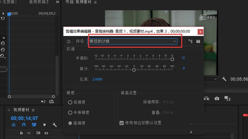 7、將預設那里改為“憤怒的沙鼠”,再去播放視頻,會發現聲音已經發生了變化喲
