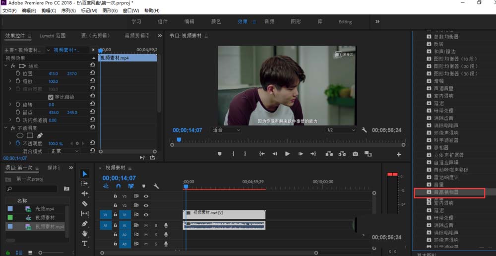 5、鼠標左鍵拖動“音高換擋器”到音頻上,然后會發現左邊的效果控件里多了“音高換擋器”這一項