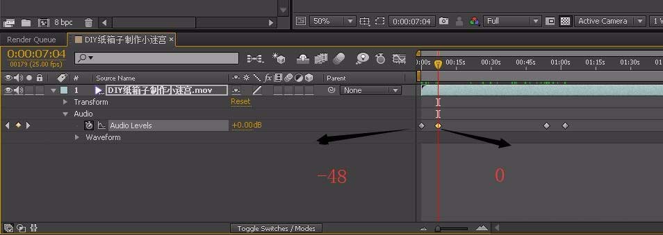 6、如果讓聲音漸漸消失,點擊前面的時間碼表后,可以在前面設(shè)置為-48;在結(jié)束幀設(shè)置為0