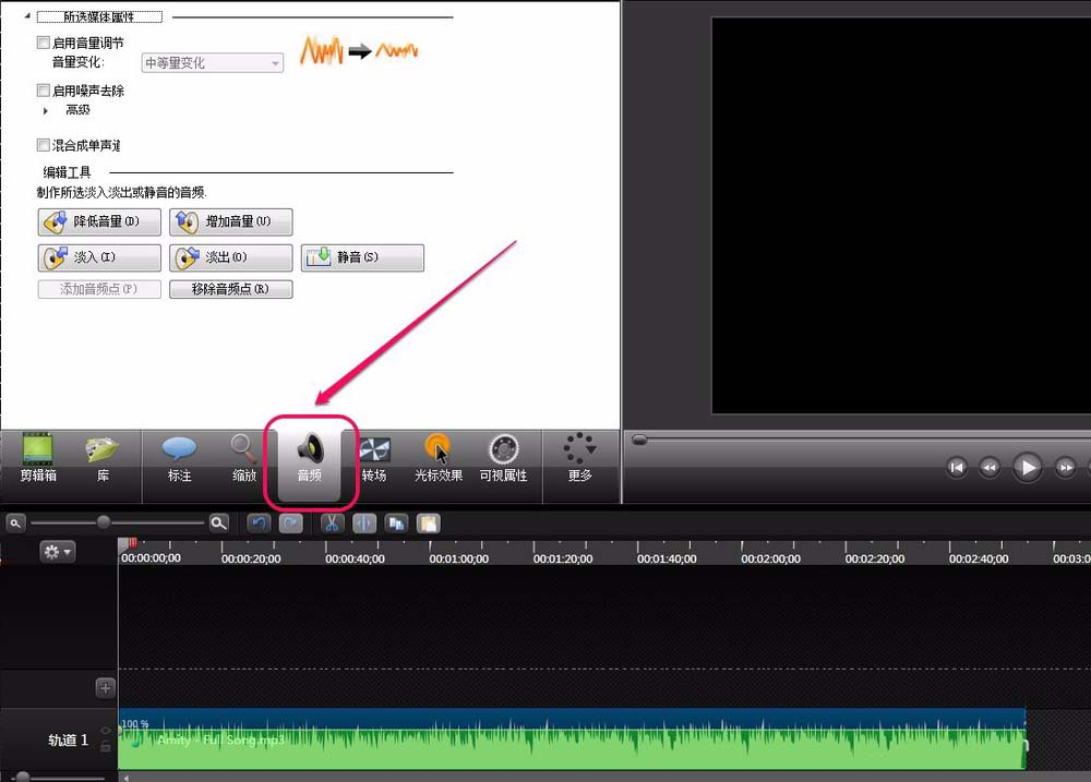3、單擊“音頻”功能按鈕,展開“音頻”編輯功能區。