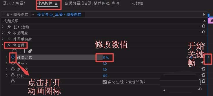 5、將時間標尺放在調整圖層開始處,選中調整圖層,找到其“效果控件”中的“塊溶解”,打開“過渡完成”前的動畫圖標,修改數值為0%,建立開始關鍵幀。