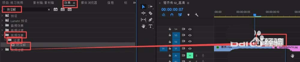 4、在“效果”控件面板中找到“塊溶解”,將其拖到調整圖層上, (“視頻效果”-“過渡”-“塊溶解”)