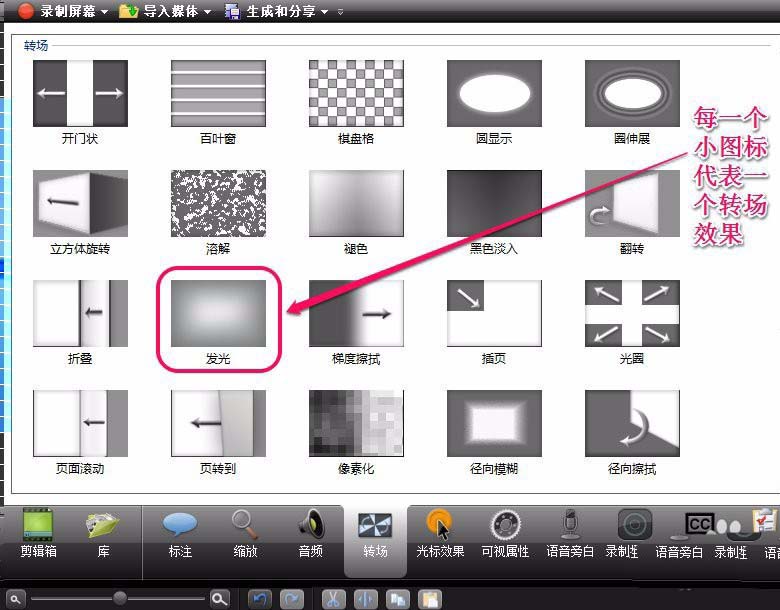5、列標中的每個矩形圖標,代表一個轉場效果。