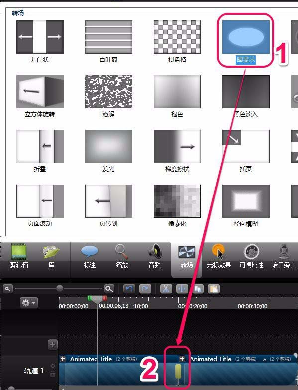 6、例如,我們選擇“圓顯示”轉場效果,用鼠標拖動移到下面軌道上2個視頻中間位置,松開鼠標左鍵。這樣一個轉場特效就被添加到了軌道上。