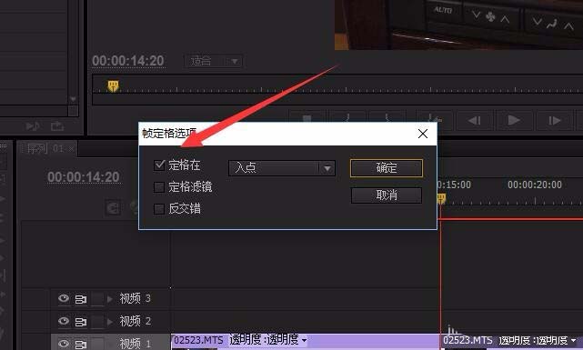 5、在“定格在”勾選“入點(diǎn)”點(diǎn)擊確定