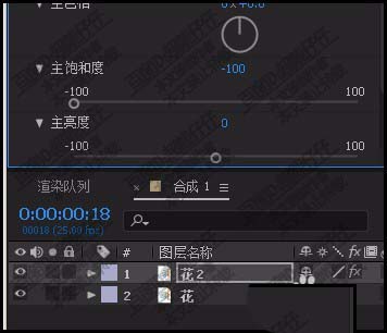 2、我們把花2層制作成貼圖層。選中花2層,添加色相飽和度效果