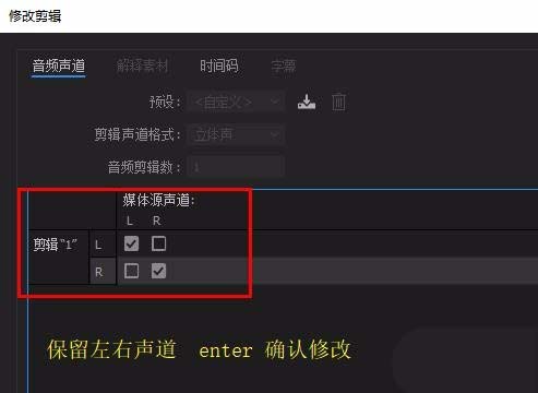 4、修改媒體源聲道,變單聲道——可點(diǎn)擊L(左側(cè))或R(右側(cè))其中一個(gè),只留一個(gè)聲道即可。按enter鍵確定。