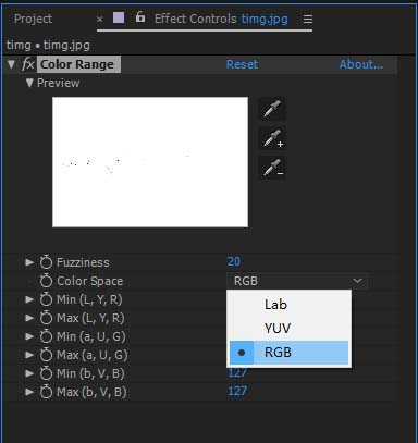 4、在effect control 給素材添加 color range(右鍵--->keying---》color range)