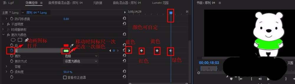 5、若想做出不停變換顏色的效果,可以為“至”打上關鍵幀,即 時間標尺放在素材開始處,打開“至”前面的動畫圖標,點擊顏色塊修改顏色,時間標尺向后移動數幀(自定),再次更改顏色,重復操作完成衣服變色效果