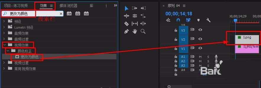 3、在“效果”面板搜索欄輸入“更改為顏色”,將其拖到v2衣服素材上