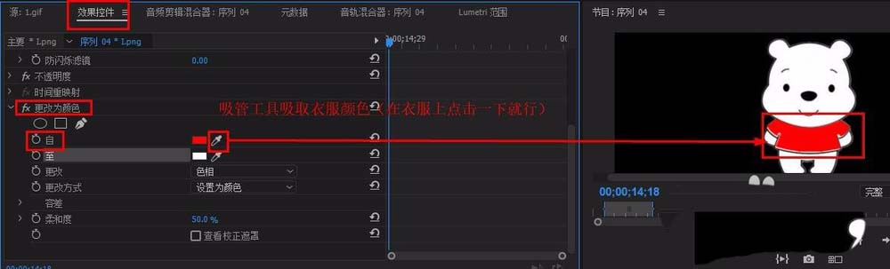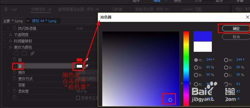 4、選中v2衣服素材,在“效果控件”面板中找到“更為改顏色”,(“視頻效果”-“顏色更正”-“更改為顏色”),修改“自” 紅色(點擊吸管圖標,再點擊衣服,吸取紅色衣服顏色),“至” 藍色(點擊矩形顏色塊,選擇想要的顏色,確定),此時衣服的顏色就已經更改了