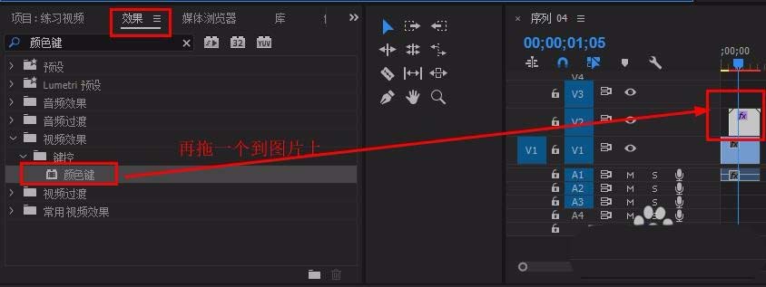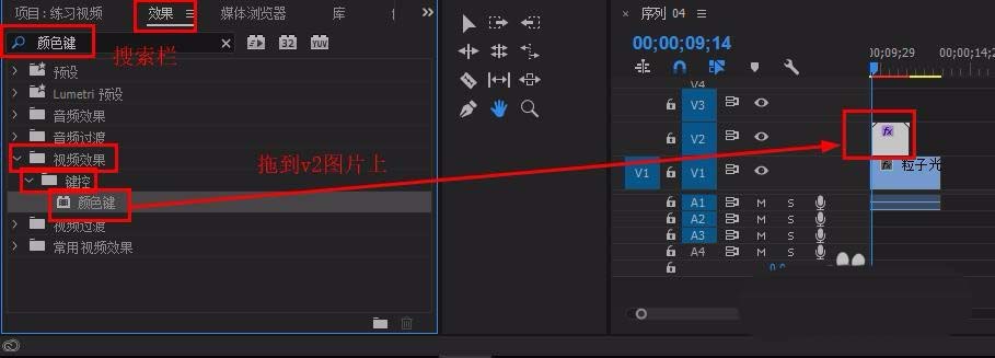 3、在“效果”面板搜索欄輸入“顏色鍵”,將其拖到v2圖片上, (“視頻效果”-“控件”-“顏色鍵”)
