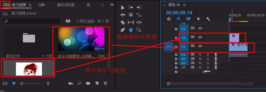 2、將視頻拖拽到v1軌道,單色背景圖片拖動(dòng)v2軌道