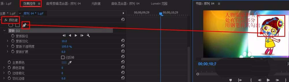 4、選中v2圖片,在“效果控件”面板中找到“顏色鍵”, 觀察背景顏色和人物中有沒有一樣的顏色,如有,利用“鋼筆”圖標(biāo)建立蒙版(直接在視頻上點(diǎn)擊建立控制點(diǎn)即可),(如圖片中眼睛和頭發(fā)有和背景白色相同的白色,所以要把它們選中)