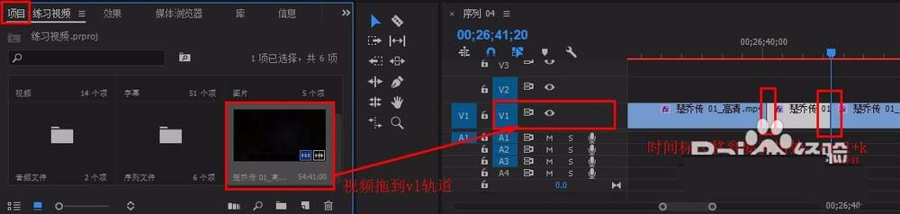 2、 2、將視頻拖到v1軌道上,利用ctrl+k(快捷方式)將要添加效果的部分剪切出來