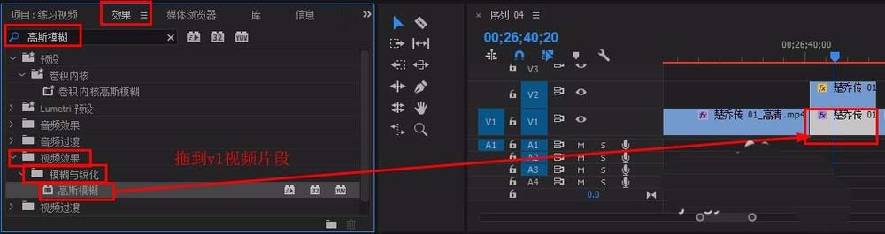 5、在“效果”面板搜索欄輸入“高斯模糊”,將其拖到v1視頻片段上