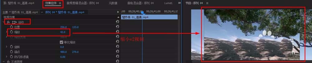 4、選中v2視頻,在“效果控件”面板找到“運動”-“縮放”,將視頻縮小的合適位置(如圖)