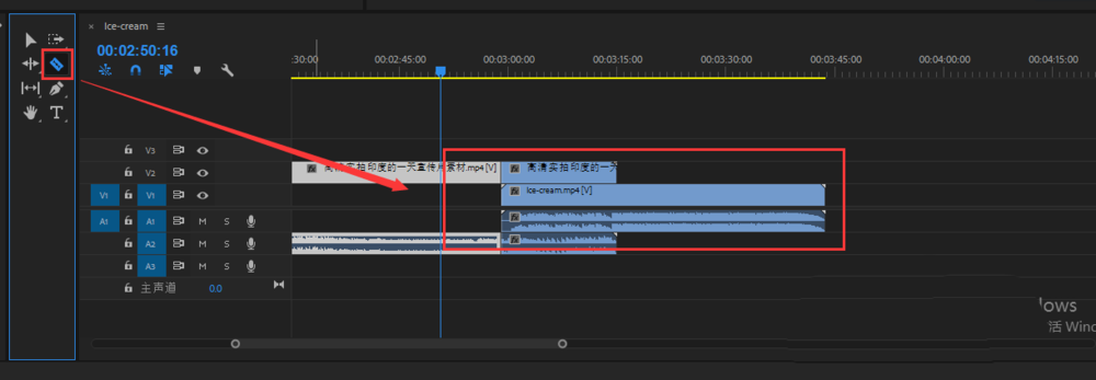 4、在時間軸窗口中,先將軌道1中的視頻移動到軌道2視頻的后面,但是讓兩個視頻有部分重合,然后選擇工具欄中的剃刀工具,在軌道2視頻與軌道1視頻重合的地方將軌道2視頻切開分成兩段。