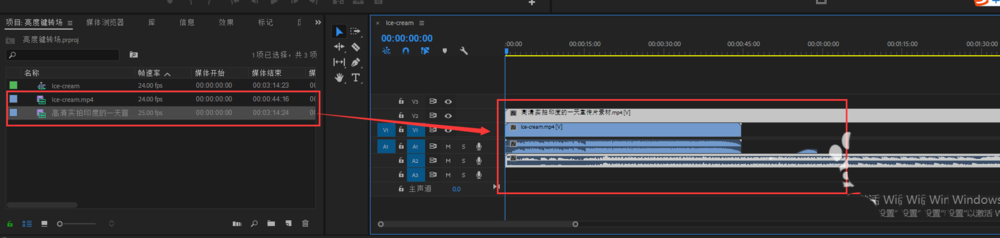 3、選中導入的視頻媒體,拖到到時間軸窗口中單擊鼠標左鍵來創建一個序列,然后再將另一個視頻媒體也拖入時間軸中,放在軌道2視頻軸上。