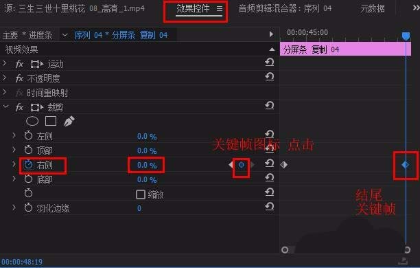 8、選中v2進度條,在其“效果控件”面板中找到“裁剪”,打開“右側(cè)”前的“動畫”圖標,建立開始關(guān)鍵幀,修改數(shù)值為100%,再將時間標尺移到進度條結(jié)尾處,點擊“關(guān)鍵幀”圖標,建立結(jié)尾關(guān)鍵幀,修改數(shù)值為 0%