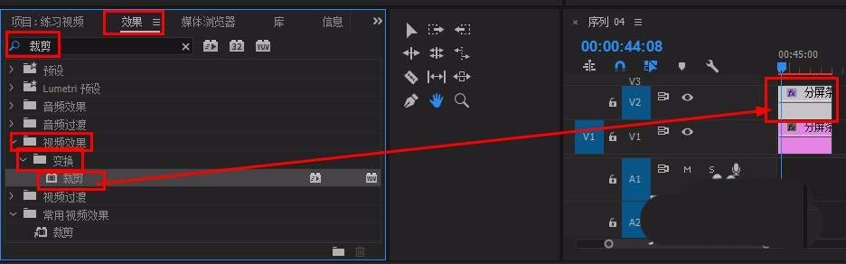 6、在“效果”面板搜索欄輸入“裁剪”,將其拖到v2進度條上,(“視頻效果”-“變化”-“裁剪”)