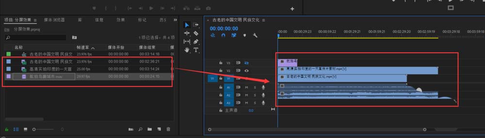 3、分別選中三個視頻素材,拖入到右側的時間軸窗口中,并將三個視頻分別依次放在視頻1軌道,視頻2軌道與視頻3軌道中。