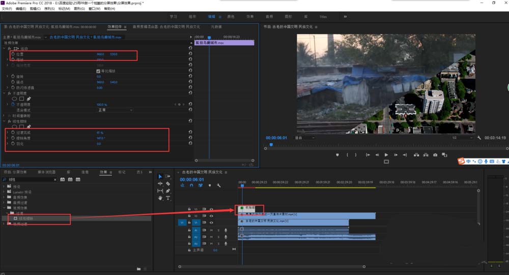 4、選中最上面軌道3中的視頻,打開效果窗口,搜索“線性擦除”效果,選中該效果拖動施加到軌道3的視頻中,然后在效果控件窗口中進行相應的效果設置,首先調整線性擦除效果中過渡完成與擦除角度的數值,在適當調整位置,這個數值不是死的,只要調整到你覺得合適就可以了。