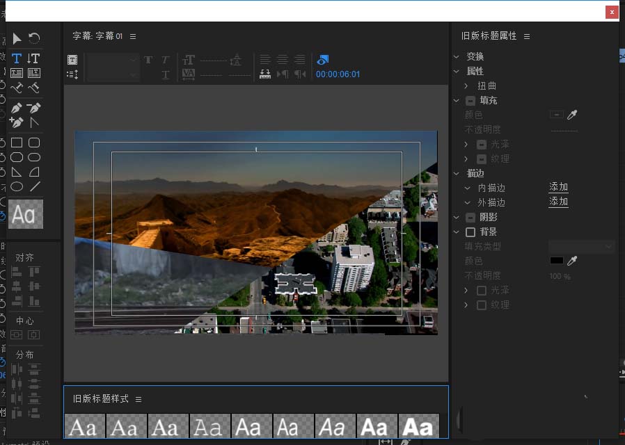 7、在打開的字幕編輯窗口中,找到工具欄中的矩形工具,繪制出兩條寬度合適的矩形,然后將其進行旋轉,移動到分屏視頻的分割線出;在用矩形工具在視頻邊框四周畫出矩形長條。使其更好看。編輯好之后就可以退出字幕窗口。