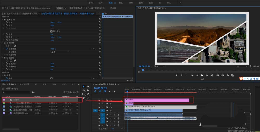 5、同理,在選中軌道2中的視頻,將線性擦除效果也施加給軌道2視頻,同樣的在效果控件中調整線性擦除效果的過渡完成與擦除角度的數值。調整到合適即可。