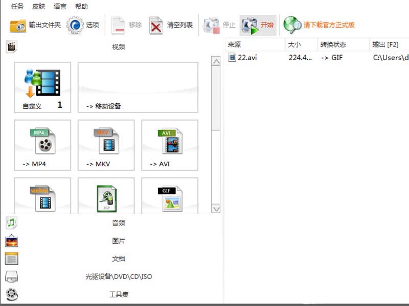 6、啟動格式工廠,選擇gif格式,將剛才導出的視頻導入,點擊開始按鈕將其轉換為gif格式。
