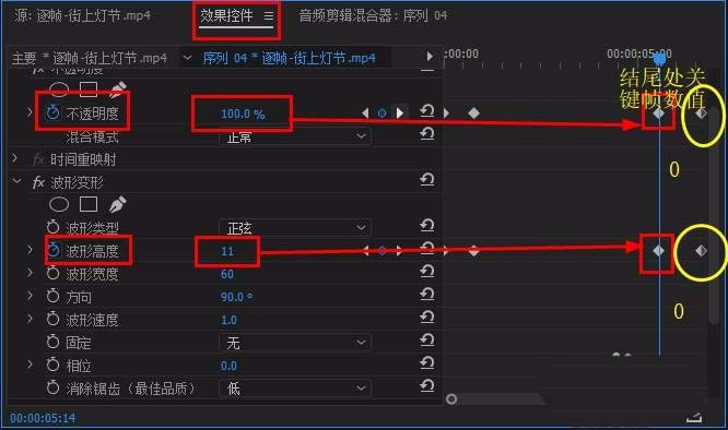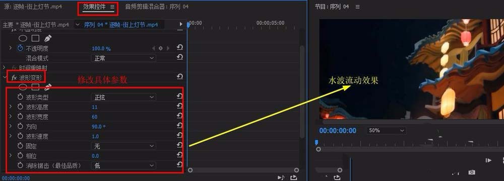 3、在“效果控件”面板中找到“波形變形”,修改其具體參數,調整波紋的大小及流動速度等,完成波形效果