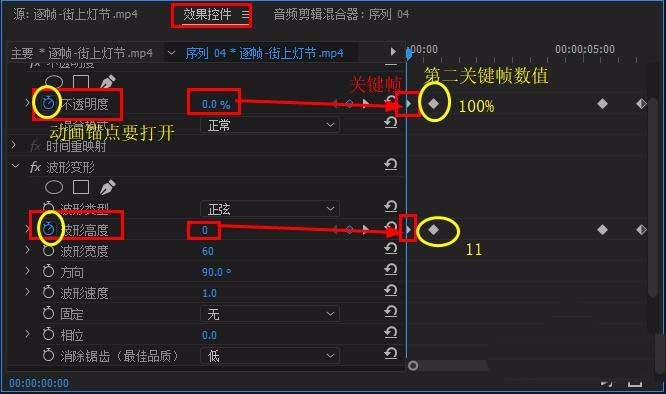 開始處,“不透明度 0”“波形變形 高度 0”,移動幾秒后,“不透明度 100%”“波形變形 高度 11(自行決定)”,結尾前幾秒處,“不透明度 100%”“波形變形 高度 11(自行決定)”,移動幾秒(即結尾處),“不透明度 0”“波形變形 高度 0”