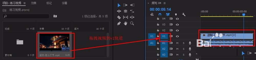 1、打開pr軟件,在“項目面板”空白處雙擊導入一段視頻素材;將視頻拖入v1軌道中
