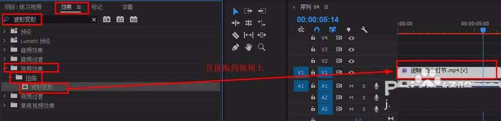 2、在“效果”面板搜索欄輸入“波形變形”,將它拖入視頻中。(“效果”-“視頻效果”-“扭曲”-“波形變形”)