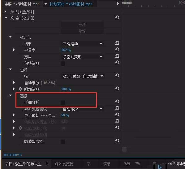 7、效果控件-變形穩定器-高級可以進行詳細分析,當然我們這個時間呢也會花的更多,所輸出的畫面效果也會更加好
