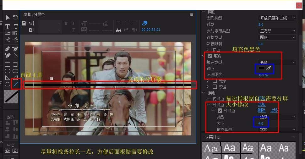 2、在形狀中選擇“直線工具”,拖到字幕板中拉開(盡可能長一點),修改“填充色-黑色”(要喜歡彩色的分屏條也可以),“外描邊”填充黑 色,大小改至合適即可。調整字幕條在畫面中的位置,完成關閉窗口即可