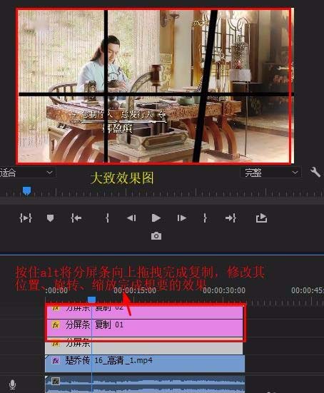 4、若想制作多個分屏效果,按住alt向上復制分屏條,修改位置、縮放、旋轉等數值即可(如圖)
