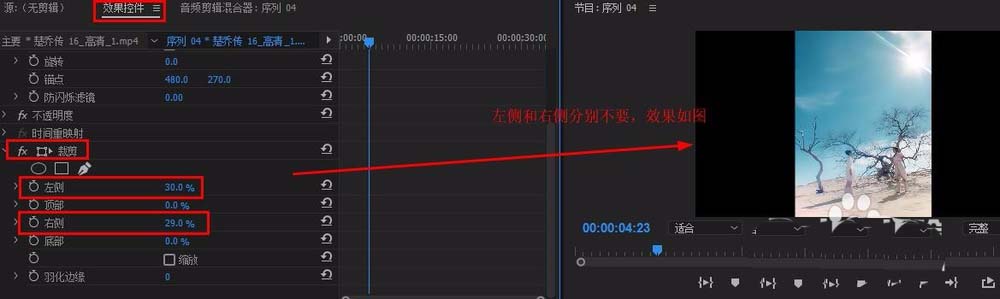 2、關閉v2、v3的眼睛,只顯示v1視頻,在“效果面板”搜索欄輸入“裁剪”(“視頻效果”-“變換”-“裁剪”),將它拖拽至v1視頻上,選中v1視頻,找到“效果控件”面板,修改“左側”與“右側”數值,裁剪視頻(如圖)