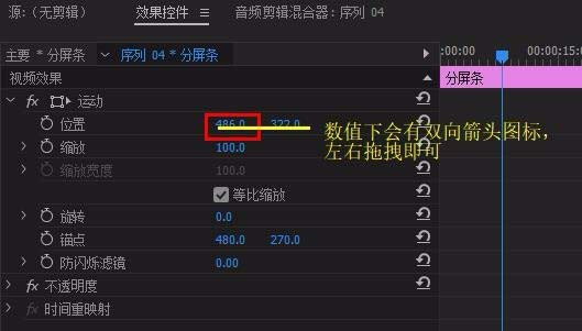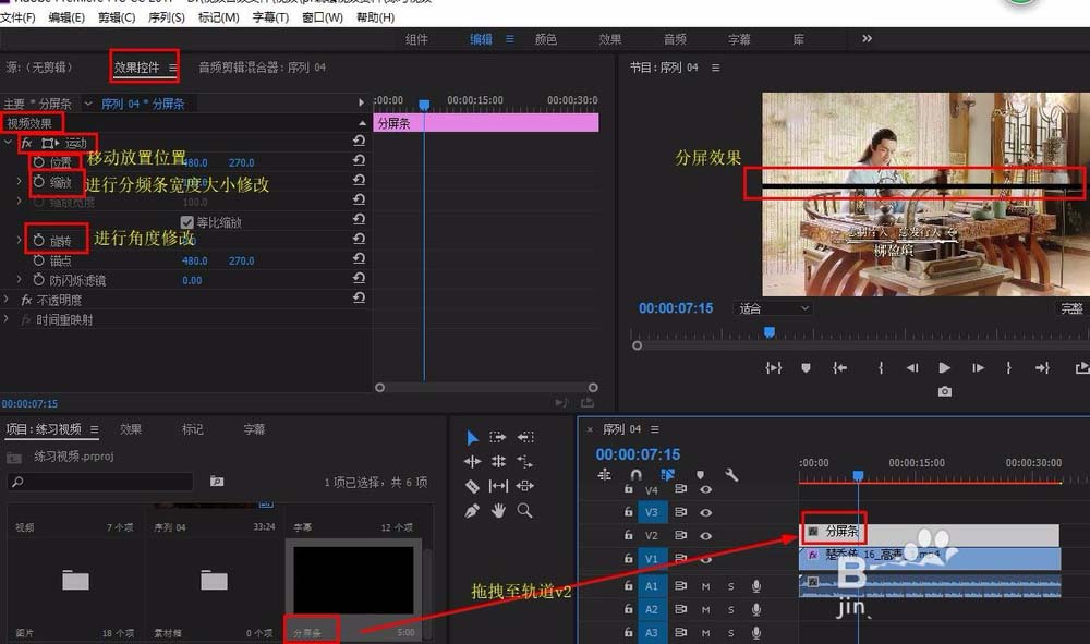 3、將導入好的視頻拖拽至v1軌道,分屏條拖至v2軌道,完成分屏效果,(若分頻條位置要修改,可選中分頻條,找到“效果控件”-“位置”進行移動,也可以通過“旋轉”實現不同角度的分屏)。