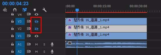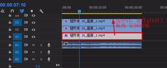 1、將視頻素材拖至v1軌道,按住alt鍵向上復制兩層至v2、v3(如圖)