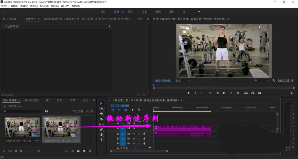 3、在項目面板中雙擊打開視頻素材,然后選中視頻拖動到時間線上新建序列