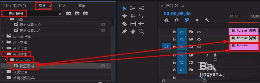 4、找到“效果面板”,在搜索欄輸入“快速模糊”, (“效果”-“視頻效果”-“obsolete”-“快速模糊”), 將它拖到v1和v2軌道視頻上