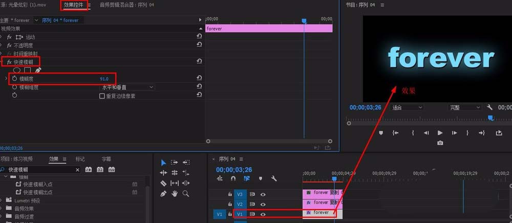 5、選中v1視頻,找到“效果控件”-“快速模糊”,將v1“模糊度”調大(讓文字的光發散出來),選中v2視頻,找到“效果控件”-“快速模糊”,將v2“模糊度”調大一點即可(有內光源的感覺6、)