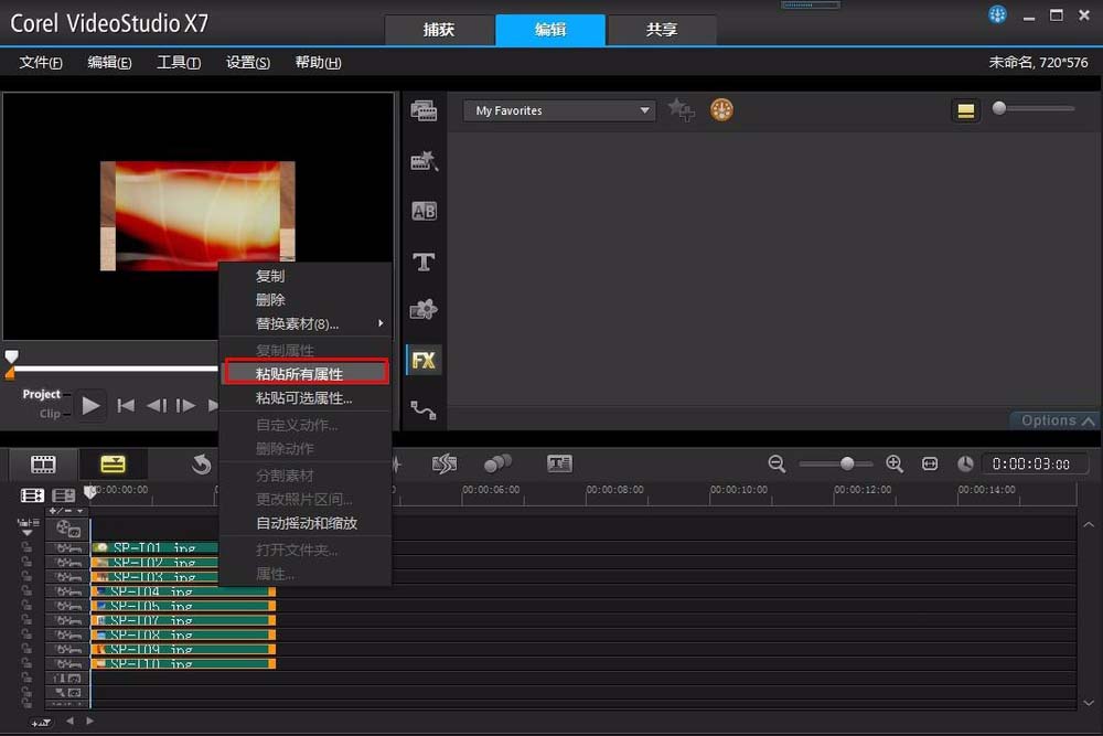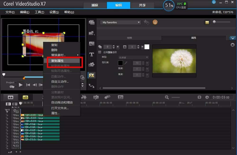 9、設置好之后,右擊覆疊軌1的素材,在右鍵菜單中選擇復制屬性,然后選中剩余的8個覆疊軌素材,同樣右擊鼠標,在右鍵菜單中選擇粘貼所有屬性,這樣9個素材就都加上了一樣的邊框。