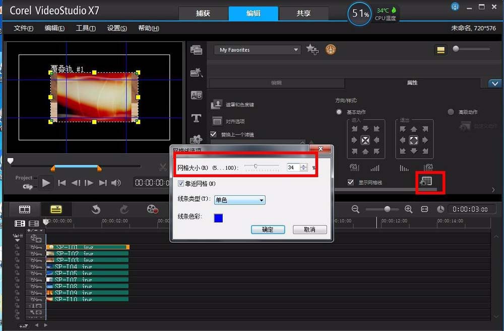 5、接著點擊第一個覆疊軌的圖片素材,然后在右上的區域會顯示設置素材的一些參數,其中有一個顯示網格線的選項,將其前面打上勾,同時在視頻預覽窗口就會顯示網格線。