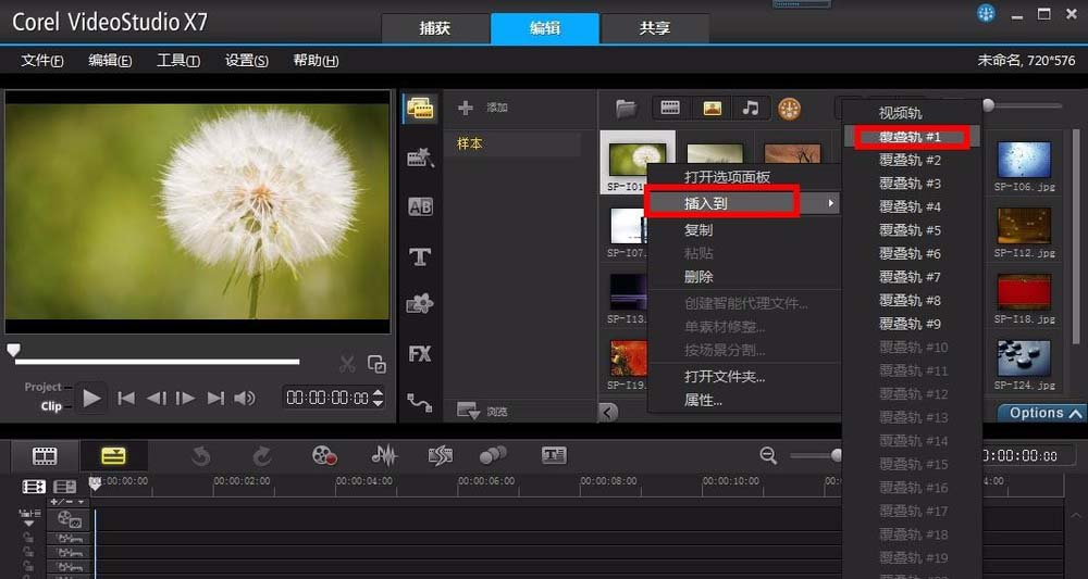 4、接下來就要這9個覆疊軌里添加素材了,當然視頻和圖片都是可以的,這里先添加一些圖片做為例子,點擊素材庫里的圖片,右擊選擇插入到,然后選擇要插入的覆疊軌編號,每個覆疊軌里插入一張圖片,總共插入9張圖片。