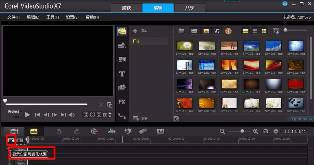 1、首先打開會聲會影軟件,任意版本都是可以的,這里用的是x7的版本,打開后進入到軟件的主界面,下邊就是視頻軌的面板。