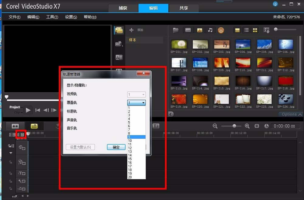 2、在視頻軌的左上角有個加減號的圖標,點擊打開,就會彈出視頻軌道管理器的窗口,這里點擊覆疊軌,添加9個覆疊軌。