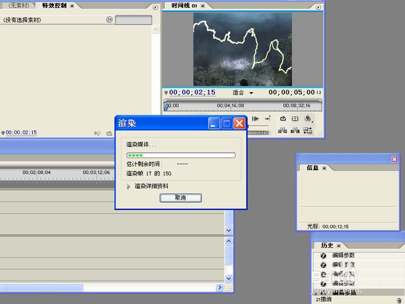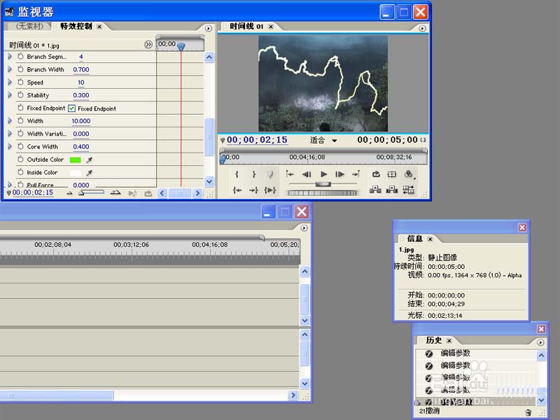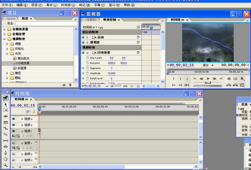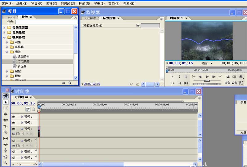 2、執行特效-視頻特效-閃電效果命令,將該效果拖拽到視頻軌道1上。